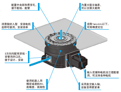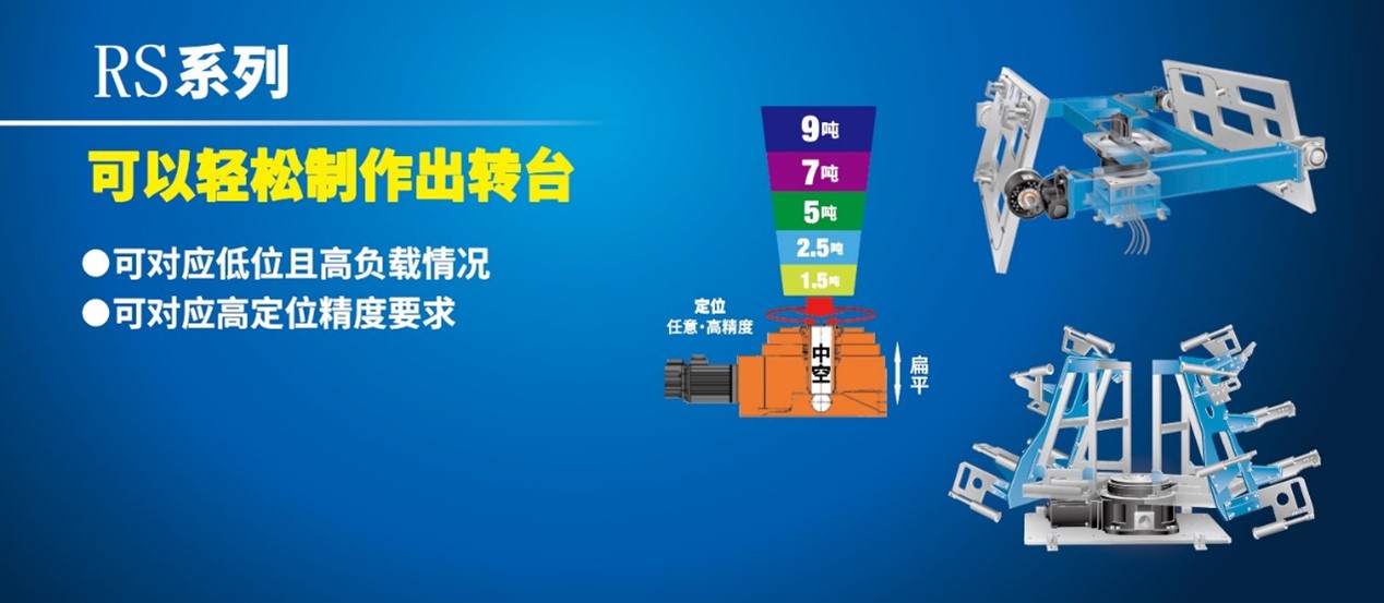 RS系列产品由于其主轴承内置结构,根据型号不同,最大允许9吨的载荷。其精密减速机RV的内核保证了高精度定位。根据其产品特点,RS系列产品适用于很多需要较大承重同时可以可靠、精确定位的变位机,转台等应用场合。