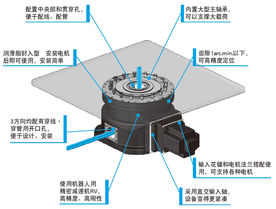 纳博特斯克的齿轮头产品,是将获得高精度、高刚性、高可靠性评价的精密减速器RV封入了适量润滑脂,便可与客户指定电机进行简单组装的减速机产品。RS系列不仅拥有1.5吨~9吨负载的产品阵容,并对产品进行了扁平化的设计。大中空径可以通过各种动力、传感器、空气的管线,在整体设计时更具有自由度。帮助客户轻松地制作出低位且高负载的高精度定位转台设备。