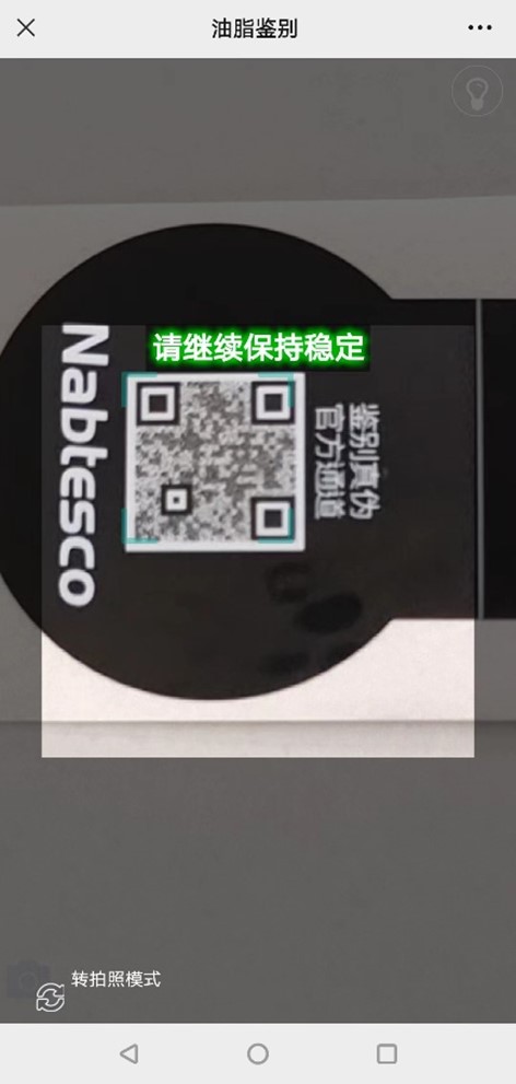 A:请在步骤⑧时的自动识别模式画面,打开右上角的手机闪光灯图标。打开闪光灯后,请避免灯光在油脂标签二维码上的反射。