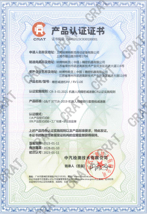 此次获得认证的是RV-110E产品,该产品顺利通过了减速器国家标准GB/T 37718-2019中的弯矩载荷、额定寿命等一系列测试,同时也通过了工厂检查。在生产质量保证能力、产品一致性等方面达到中国机器人认证的标准要求,具有足够的可靠性,进一步提升产品市场竞争力。纳博特斯克作为精密减速机RV产品的创立者,承担起重要责任,为提升中国机器人核心零部件的整体质量,为中国制造业的不断发展与进步做出贡献。