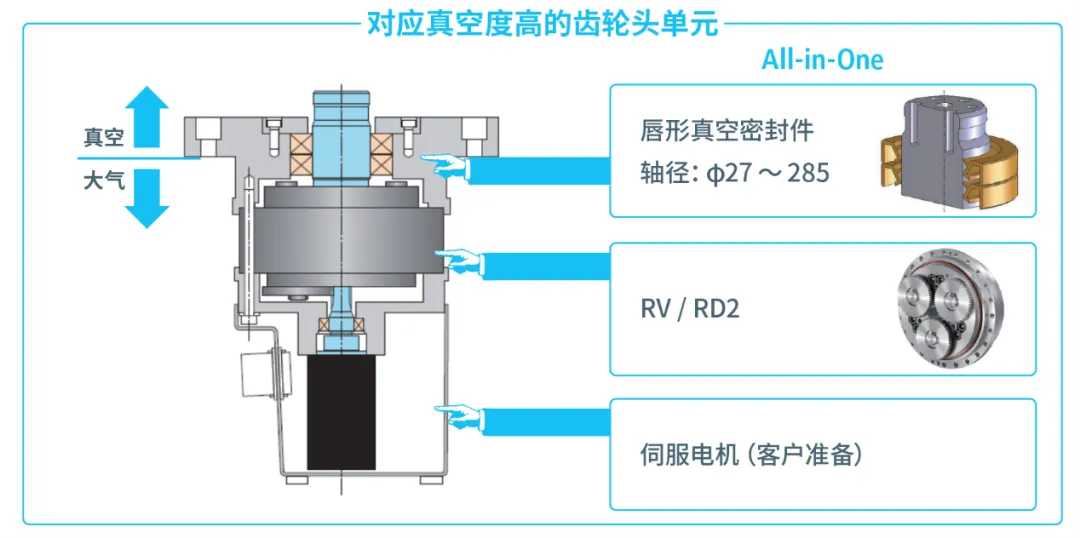 纳博特斯克为了满足真空晶圆搬送设备的洁净度和稳定性需求,推出了唇形真空密封件与精密减速机RV紧凑融合而成的齿轮头单元——HR系列。该系列产品因采用不会破裂的接触式唇形密封件,结构紧凑,且安装、使用方便,可有效缩短FPD搬运用机器人、晶圆搬运装置的组装时间,且有相当高的安全性。